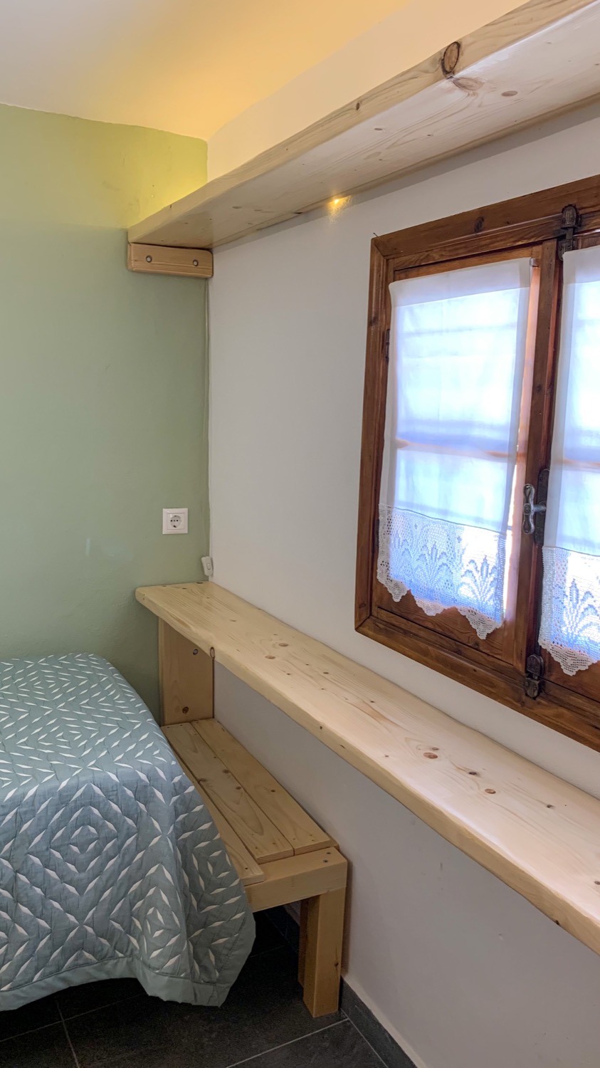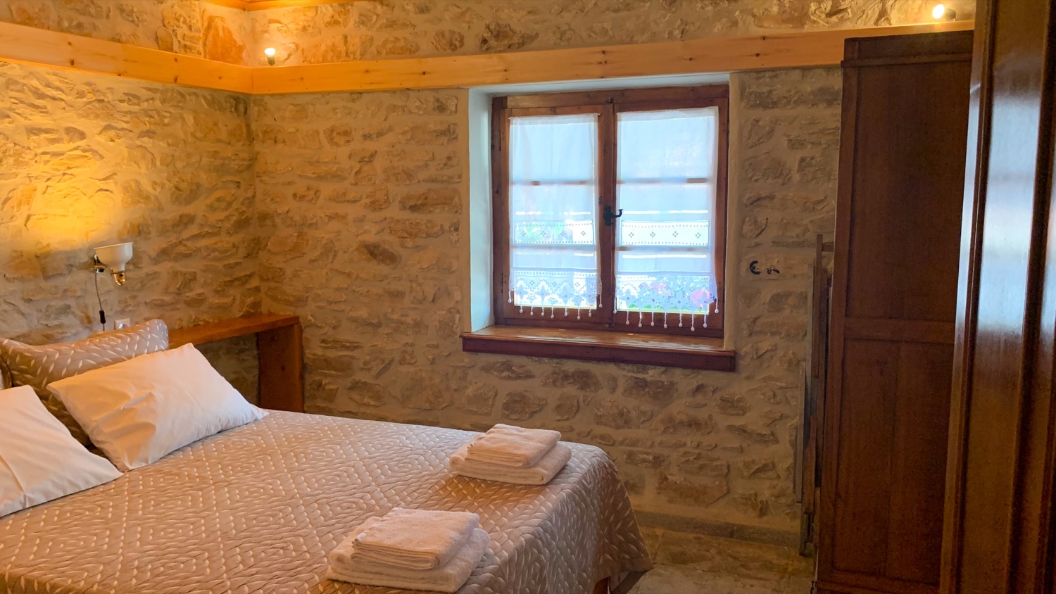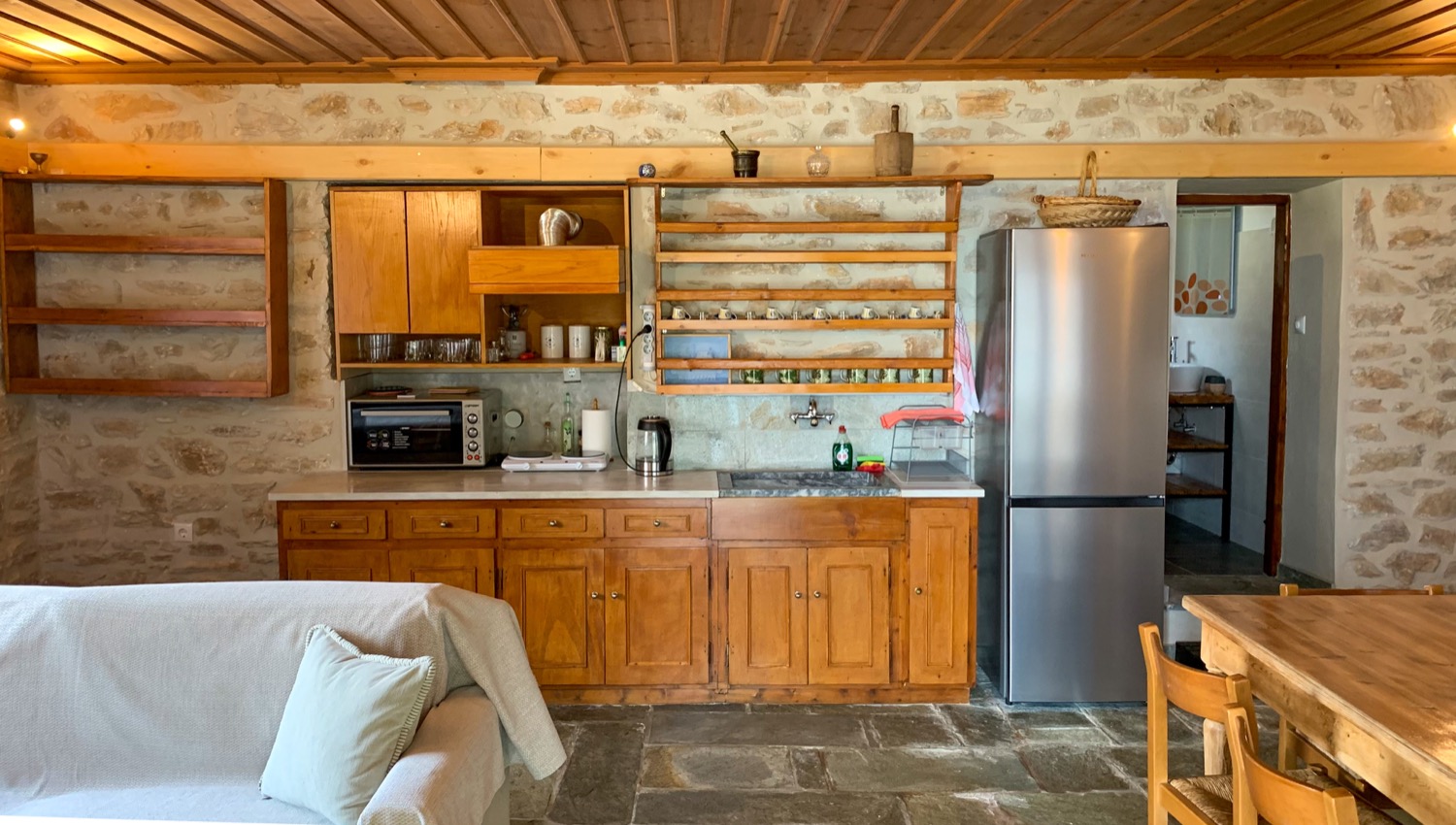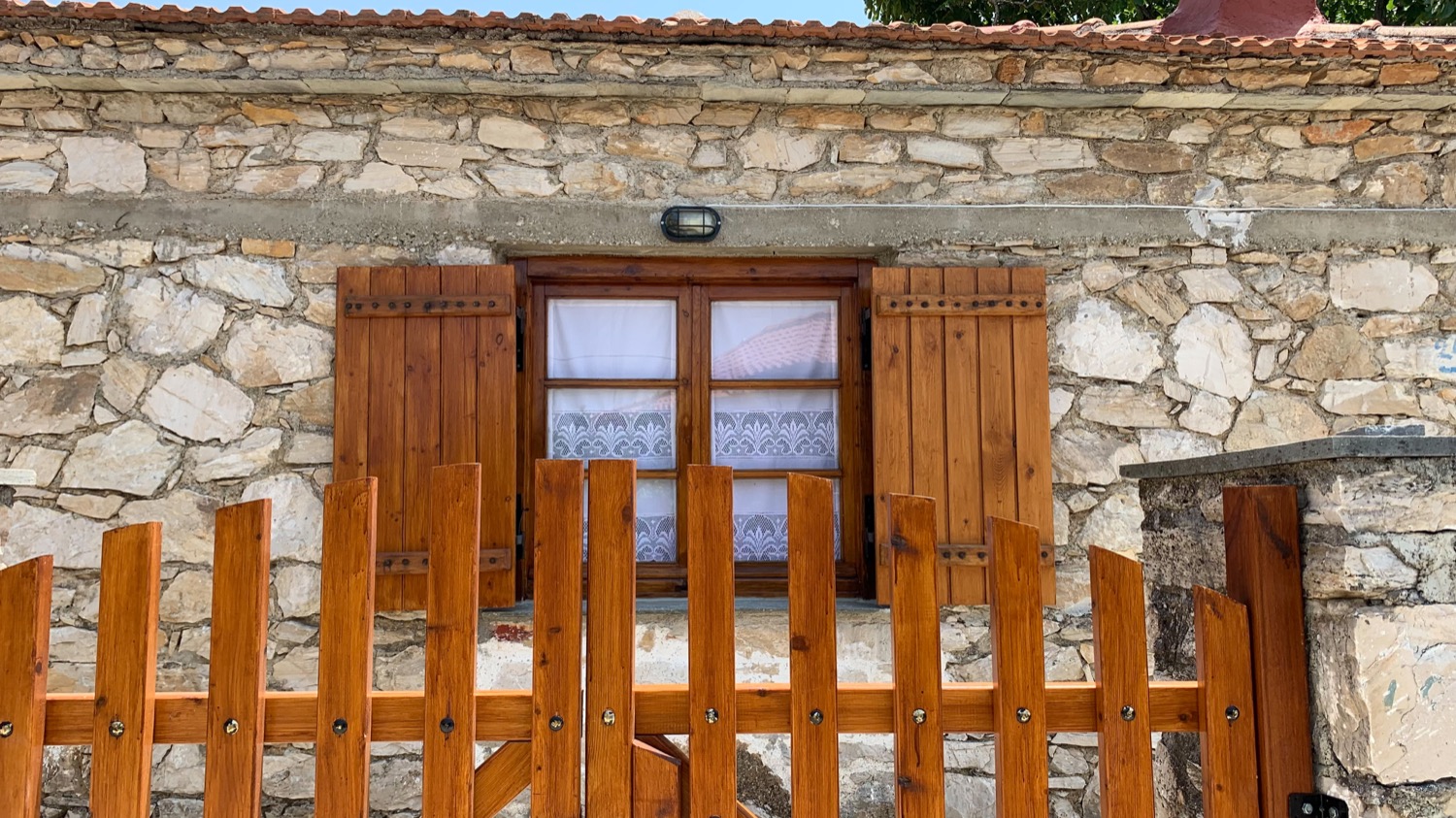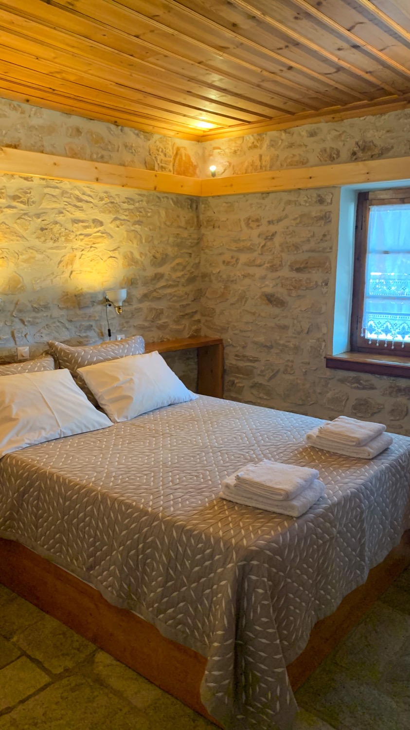 Είναι πετρόκτιστο και αποτελείται από ένα μεγάλο καθιστικό - κουζίνα, δύο υπνοδωμάτια με διπλά κρεβάτια και μία μεγάλη βεράντα. Μπορούν να κοιμηθούν μέχρι 8 άτομα. Από δύο σε κάθε υπνοδωμάτιο και άλλα 4 στο καθιστικό, σε 2 μπαουλοντίβανα με πολύ καλά στρώματα και σε έναν καναπέ-κρεβάτι. Η κουζίνα είναι πλήρως εξοπλισμένη, υπάρχει πλυντήριο ρούχων και διατίθεται και παρκοκρέβατο με ειδικά κατασκευασμένο στρώμα για βρέφη. Κάθε δωμάτιο διαθέτει ένα μοντέρνο κλιματιστικό και επίσης στο καθιστικό υπάρχει τζάκι. Ξυλεία για το τζάκι διατίθεται από εμένα. Πίσω από το σπίτι υπάρχει ιδιωτικός χώρος στάθμευσης για 2+ αυτοκίνητα και το όλο σπίτι βρίσκεται μέσα σε ένα οικόπεδο 1600τμ με δέντρα και βότανα.
