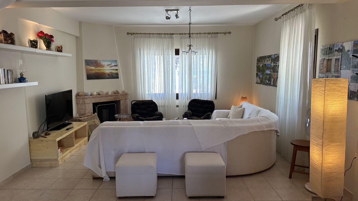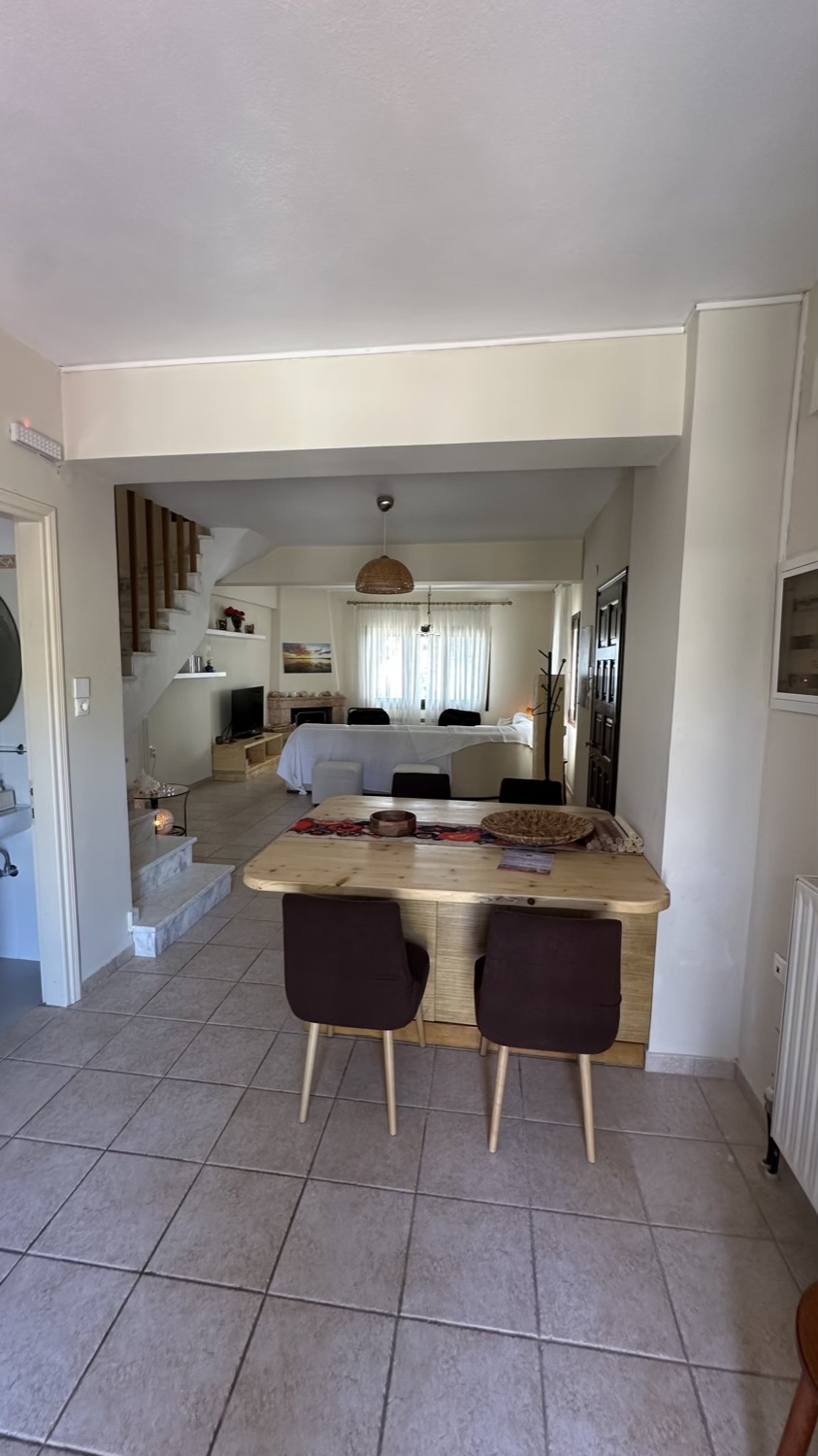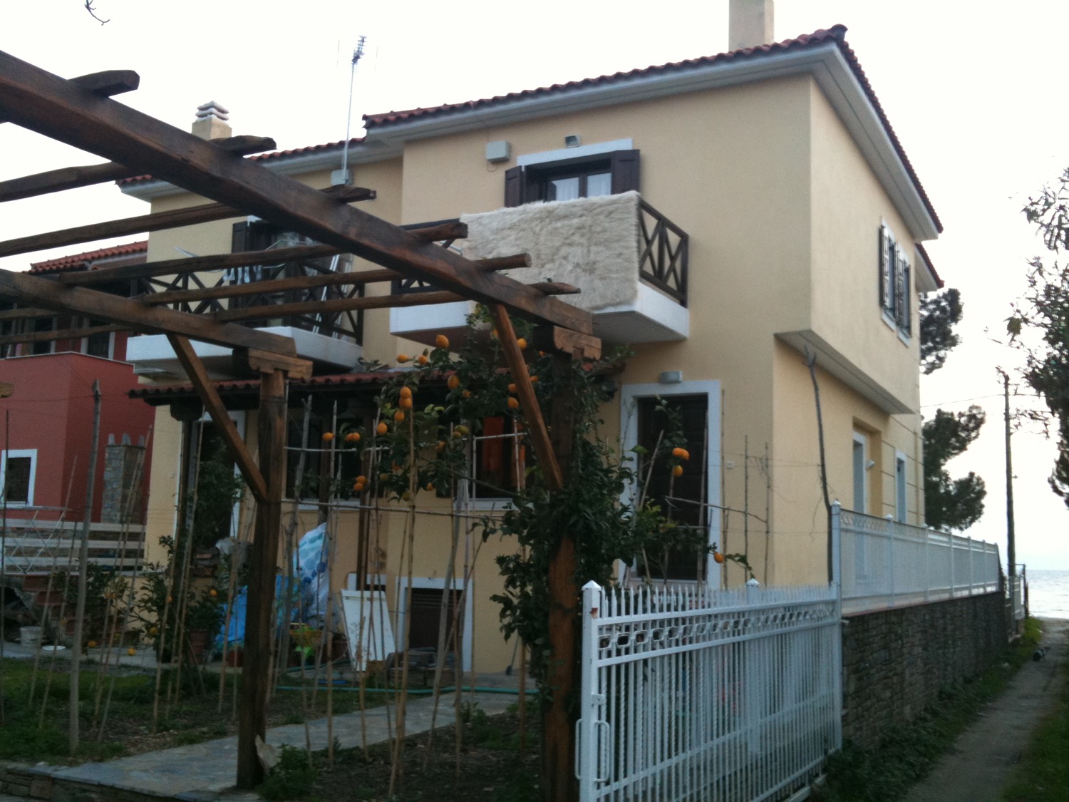 Παραλιακά σπίτιαΜία διώροφη μαιζονέτα 120 τμ ακριβώς μπροστά στην θάλασσα, που ολοκληρώθηκε το 2006 και ανακαινίστηκε ελαφρώς το 2019. Το ισόγειο αποτελείται από ένα ενιαίο σαλόνι-κουζίνα συν ένα μικρό WC ενώ ο όροφος έχει τα δύο μεγάλα υπνοδωμάτια, το μπάνιο και ένα μικρό ιδιωτικό δωμάτιο (γραφείο). Η κουζίνα είναι πλήρως εξοπλισμένη και υπάρχει και πλυντήριο ρούχων. Μπορούν να κοιμηθούν μέχρι 7 άτομα (οι δύο σε αερόστρωμα), 2 στο μπροστινό υπνοδωμάτιο, 3 στο πίσω, όλοι σε καινούργια στρώματα πολυτελείας, και 2 στο σαλόνι σε αερόστρωμα. Στην πίσω πλευρά του οικοπέδου υπάρχει χώρος στάθμευσης για δύο αυτοκίνητα και ένας μικρός κήπος (το καλοκαίρι φυτεύω ζαρζαβατικά για τους επισκέπτες). Μπροστά είναι η βεράντα του σπιτιού και ένας μεγάλος κήπος με ξαπλώστρες και χώρο αναψυχής.